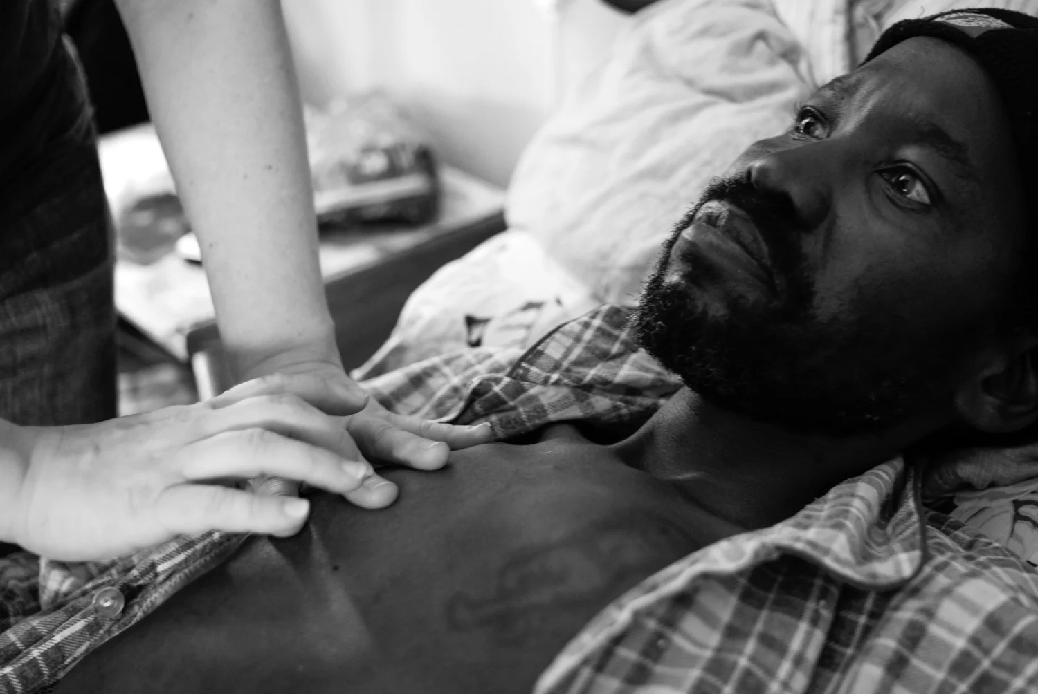 This patient had been bedridden within the treatment centre for over 6 months due to a combination of opportunistic infections and tuberculosis. After returning home for a brief period he returned he returned where I photographed him being examined